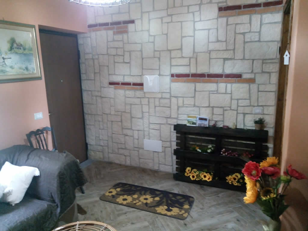 Country and comfortable lounge area in a common space endowed of TV, pellet heater for the winter